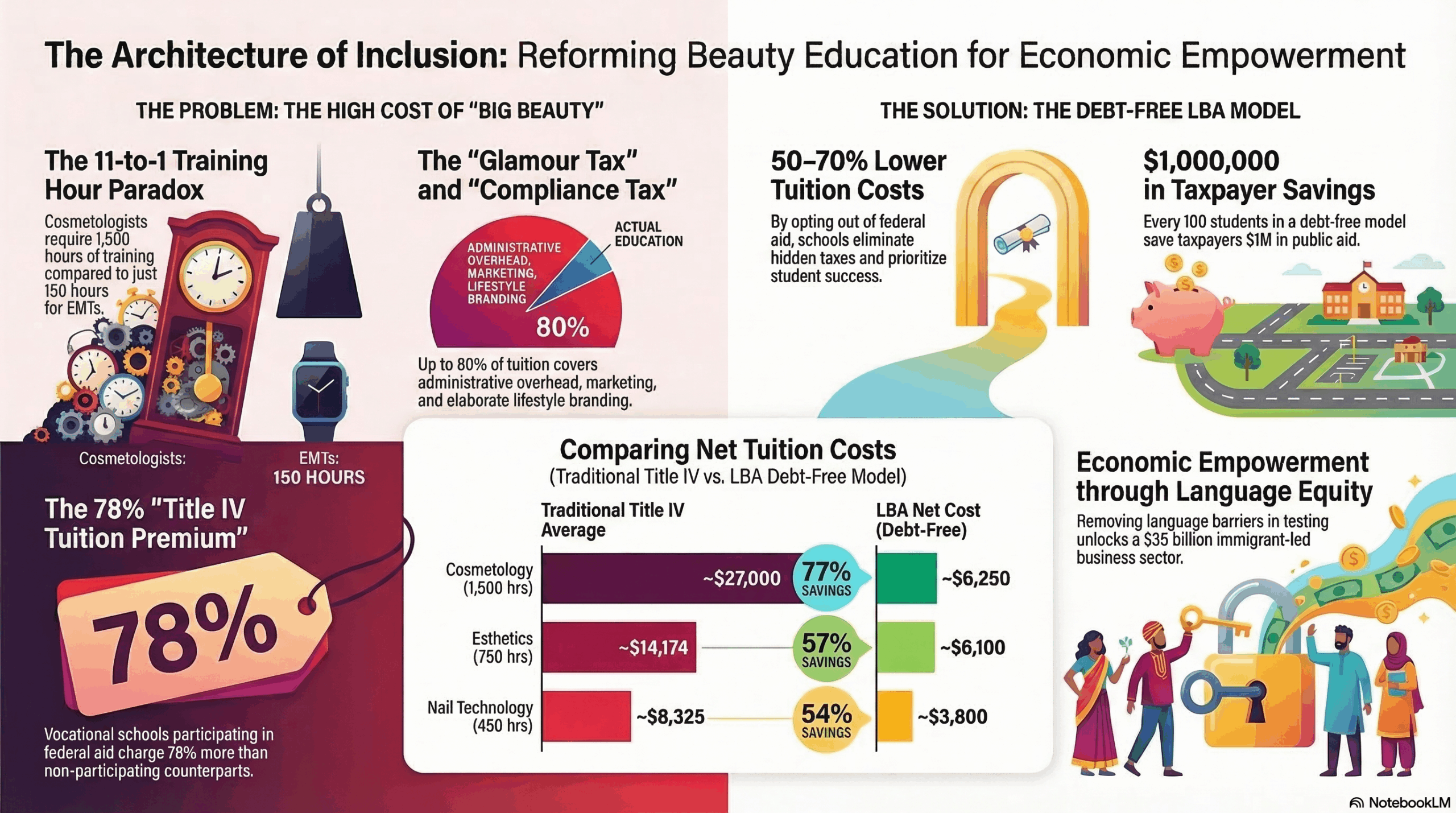The research supports a fundamental restructuring of beauty education to prioritize the economic liberty of the practitioner and the safety of the public. The “Architecture of Inclusion” positions the LBA model as a national center for debt-free economics, regulatory over-compliance, and community-service-driven training.