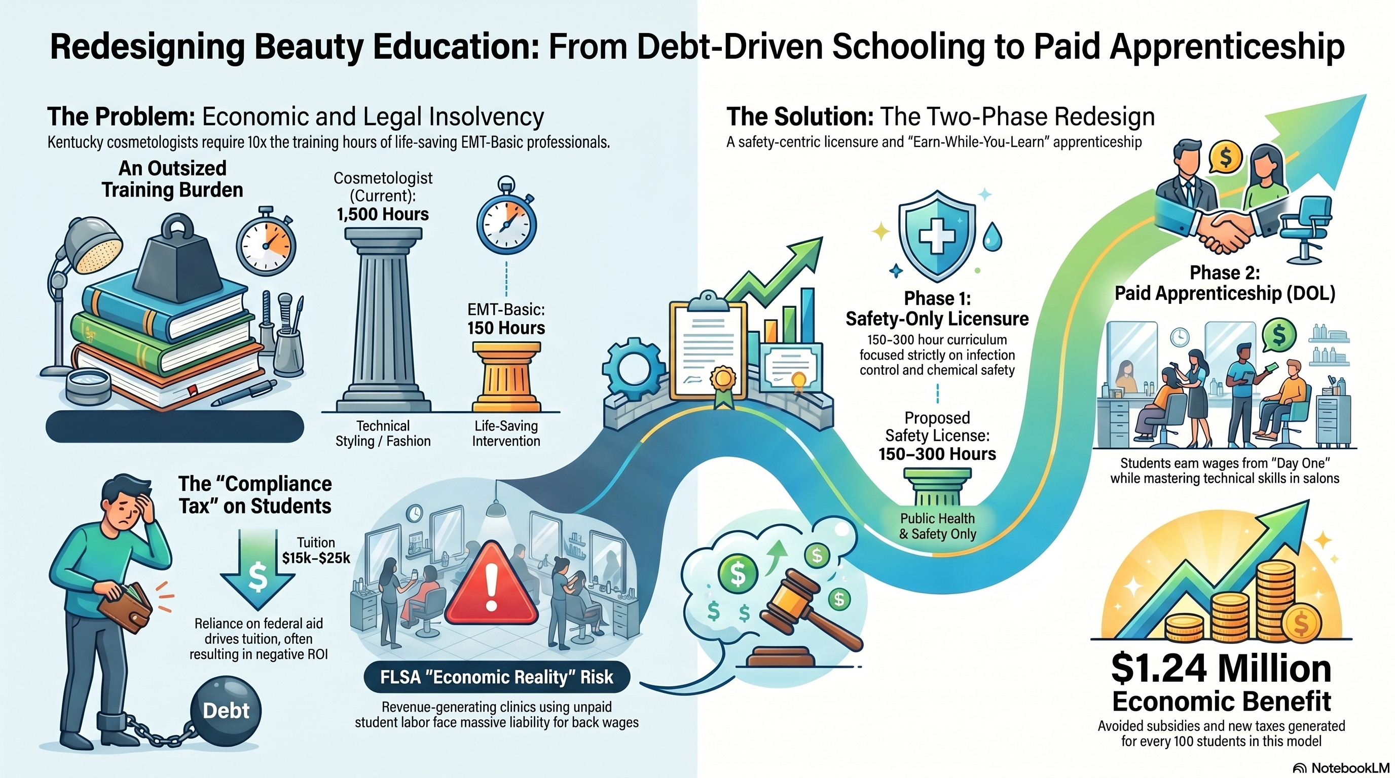 The beauty and personal care industry in the United States, currently governed by an antiquated 1,500-hour training model in states like Kentucky, stands at a precipice of legal and economic insolvency. This research report presents a comprehensive policy redesign aimed at decoupling state regulatory authority from technical vocational training. The proposed framework rests upon two essential pillars: the limitation of state licensure to public health and safety competencies (Phase 1) and the transition of all technical skill development into the United States Department of Labor (DOL) Registered Apprenticeship Program (Phase 2).1