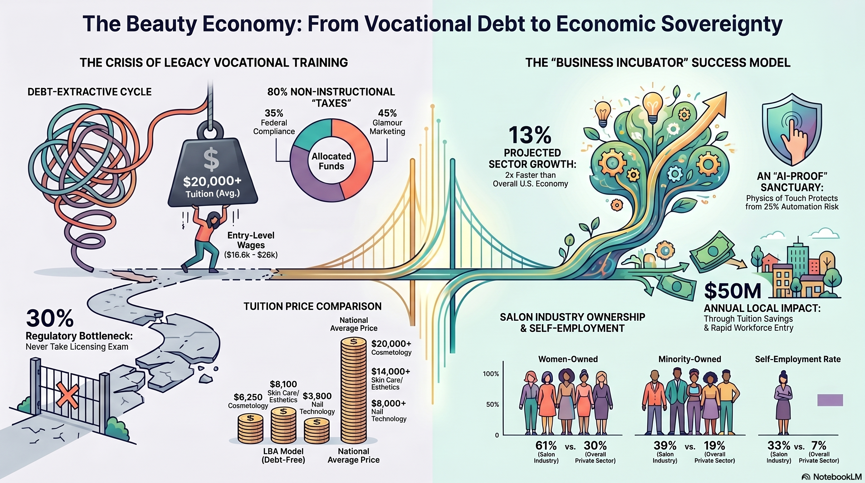 The American vocational landscape is currently navigating a period of profound structural transformation, transitioning from a static, credential-based model to a dynamic, reputation-based “proof-of-work” economy.1 Historically, the institutionalization of beauty education has been relegated to the periphery of workforce development policy, often viewed through the narrow lens of basic vocational training. However, contemporary economic data and the emergence of high-impact demonstration models suggest that this sector functions more accurately as a sophisticated small-business incubation ecosystem. The traditional sequential approach—where a learner first consumes capital through education and then produces capital in the workforce—is increasingly being replaced by the Concurrent Contribution Education Model.1 This model disruptions the legacy cycle by allowing learners to maintain labor market participation while pursuing state-regulated licensure, thereby generating tax revenue and economic value throughout the training period.1