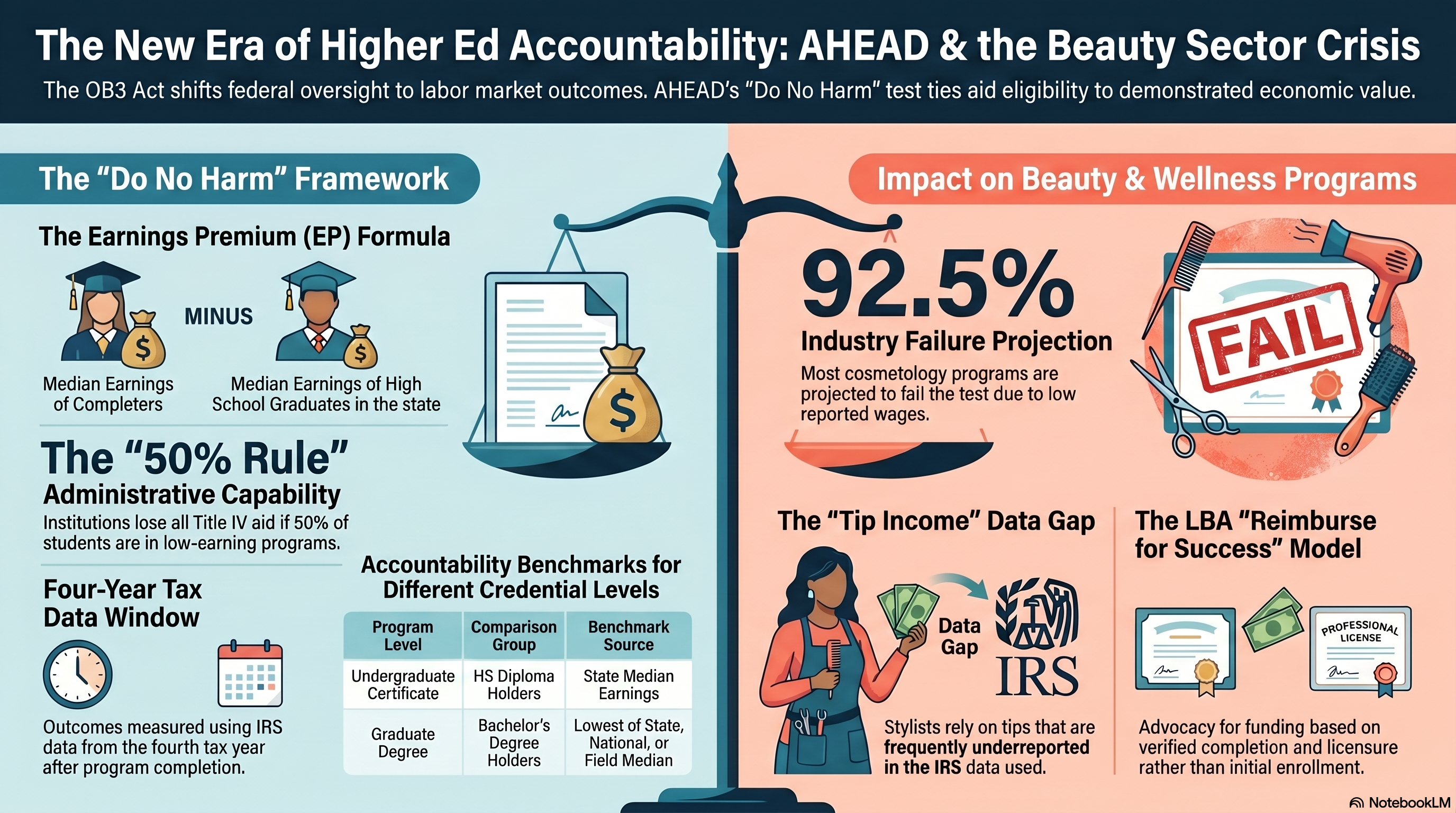 The landscape of federal higher education oversight is currently experiencing a foundational shift, transitioning from a system primarily concerned with institutional inputs to one focused almost exclusively on labor market outcomes. This transformation is crystallized in the Accountability in Higher Education and Access through Demand-driven Workforce Pell (AHEAD) negotiated rulemaking process. Established to implement the higher education provisions of Public Law 119-21, commonly known as the One Big Beautiful Bill Act (OB3), the AHEAD committee is tasked with codifying a sector-neutral accountability framework that ties federal financial aid eligibility to the demonstrated economic value of academic programs.1 This report provides a technically precise analysis of the AHEAD process, the “Do No Harm” earnings premium metrics, the Student Tuition and Transparency System (STATS), and the specific vulnerabilities of undergraduate certificate programs within the beauty and wellness sectors.