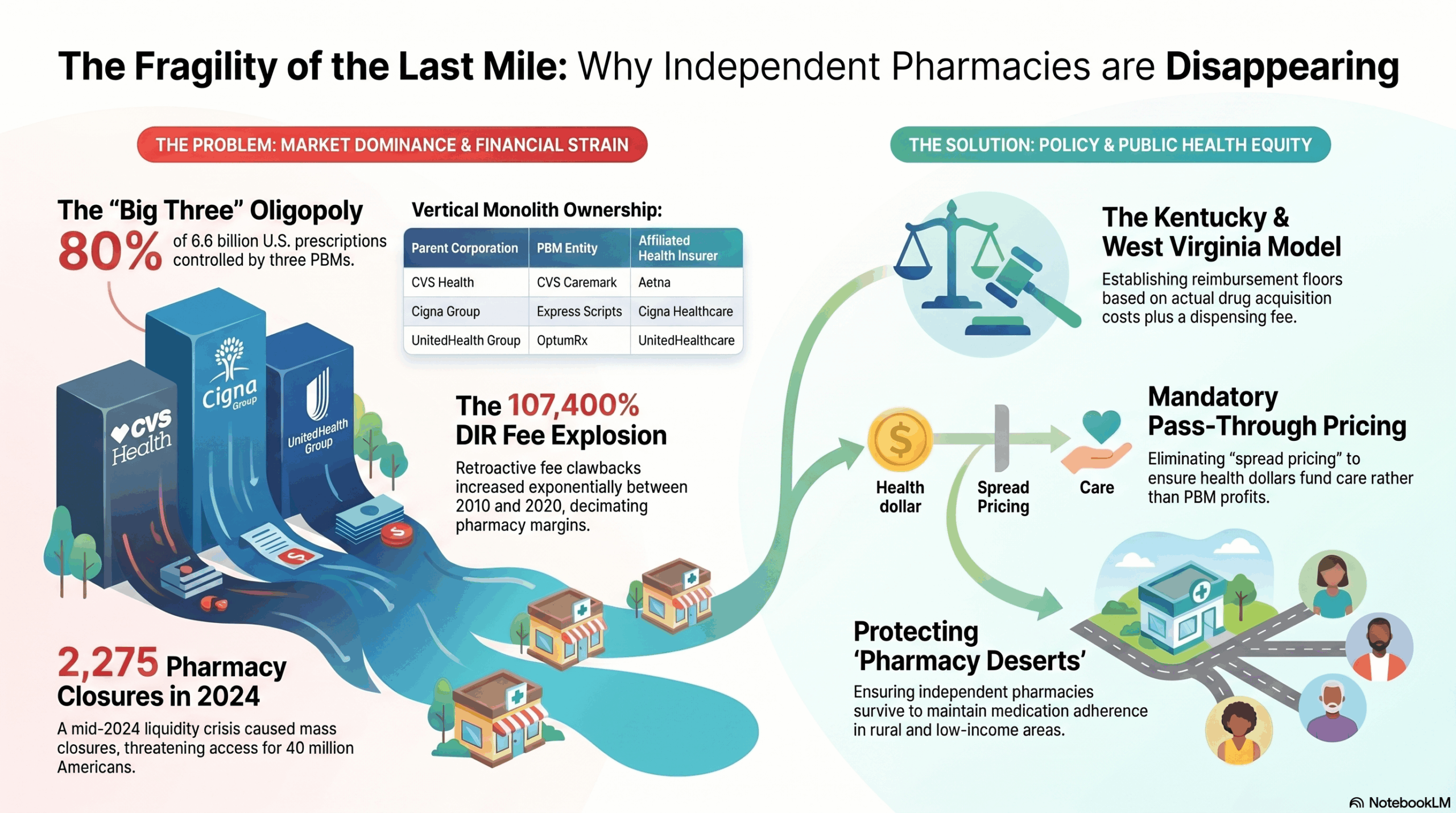 The American pharmaceutical distribution chain, once a decentralized network of community-based health hubs, has undergone a radical structural transformation over the last two decades. At the heart of this shift is the independent community pharmacy, an institution that serves as the primary point of clinical contact for millions of Americans, particularly those in rural, low-income, and medically underserved areas. However, the economic viability of these pharmacies is currently under unprecedented threat due to a convergence of market consolidation, predatory reimbursement models, and complex regulatory gaps. As the intermediaries known as Pharmacy Benefit Managers (PBMs) have evolved from administrative claims processors into vertically integrated behemoths, the independent pharmacy has been forced into a role where it often loses money on the very life-saving medications it dispenses.1